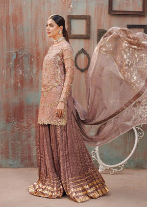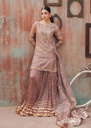 Additional Description: Short shirt with Garara paired with organza duppata, an outfit completes the look with heavy embroidery and embellishment.