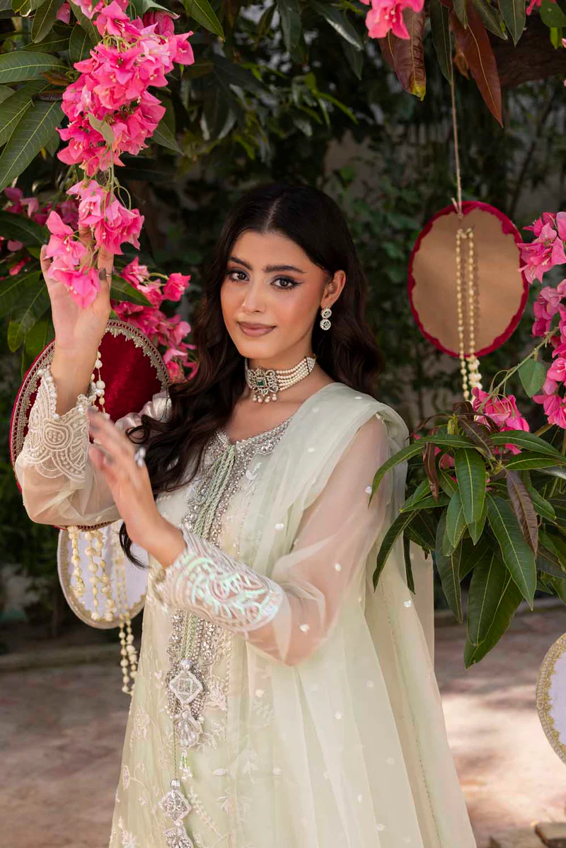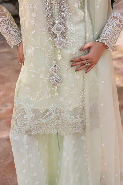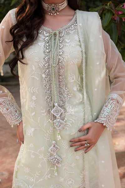 - Organza embroidered & hand Embelished shirt neckline finished with emb Nd embellished dori tassels Organza embroidered sleeves finished with embroidered border & pearls.